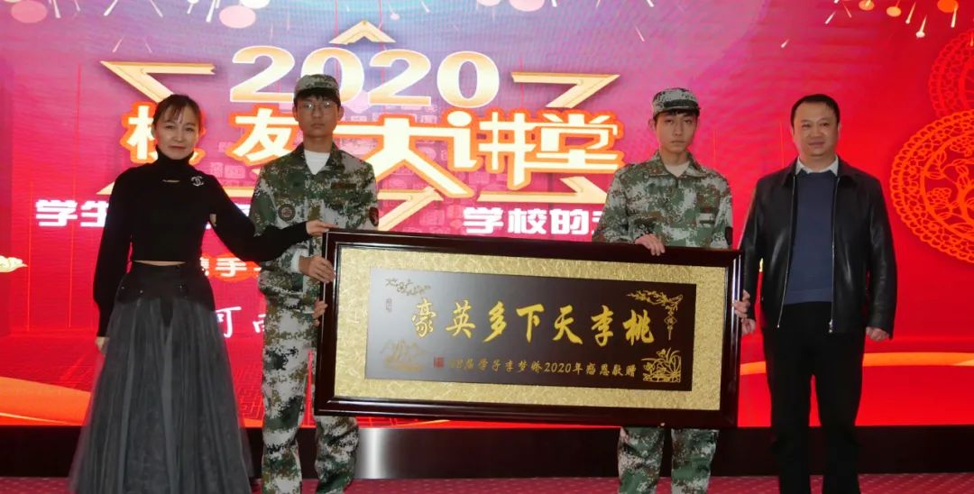 学姐李梦娇为了感谢母校的精心栽培,特赠送母校牌匾“桃李天下多英豪”。